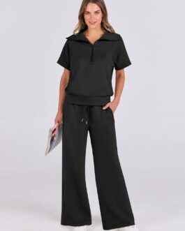 • ANRABESS Women 2 Piece Outfits Sweatsuit Summer Half Zip Sweatshirt Wide Leg Pant Sweat Lounge Set Athletic Tracksuits