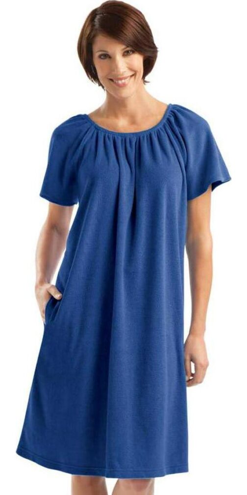 Collections Etc Solid Color Comfort Fit Short-Sleeve Terry Cotton Summer Dress with Side Pockets and Elastic Scooped Neckline
