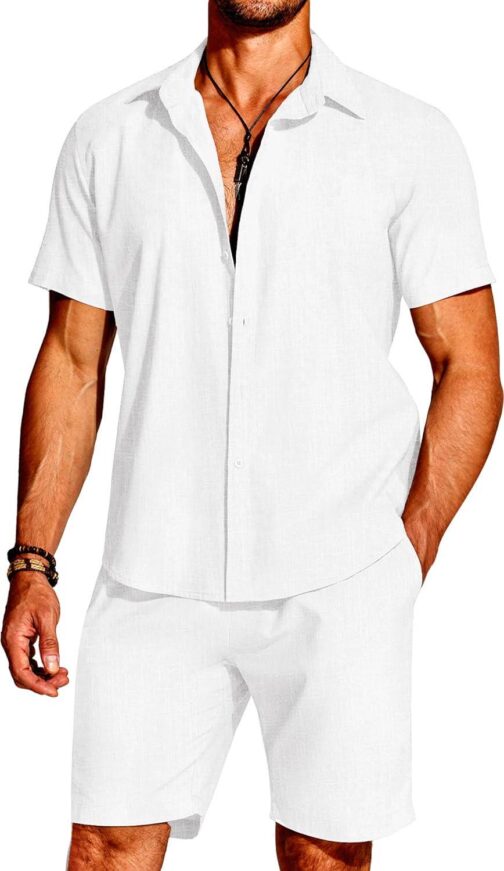 [COOFANDY Men’s 2 Pieces Cotton Linen Set Short Sleeve Button Down Shirts Summer Beach Shorts Casu…]