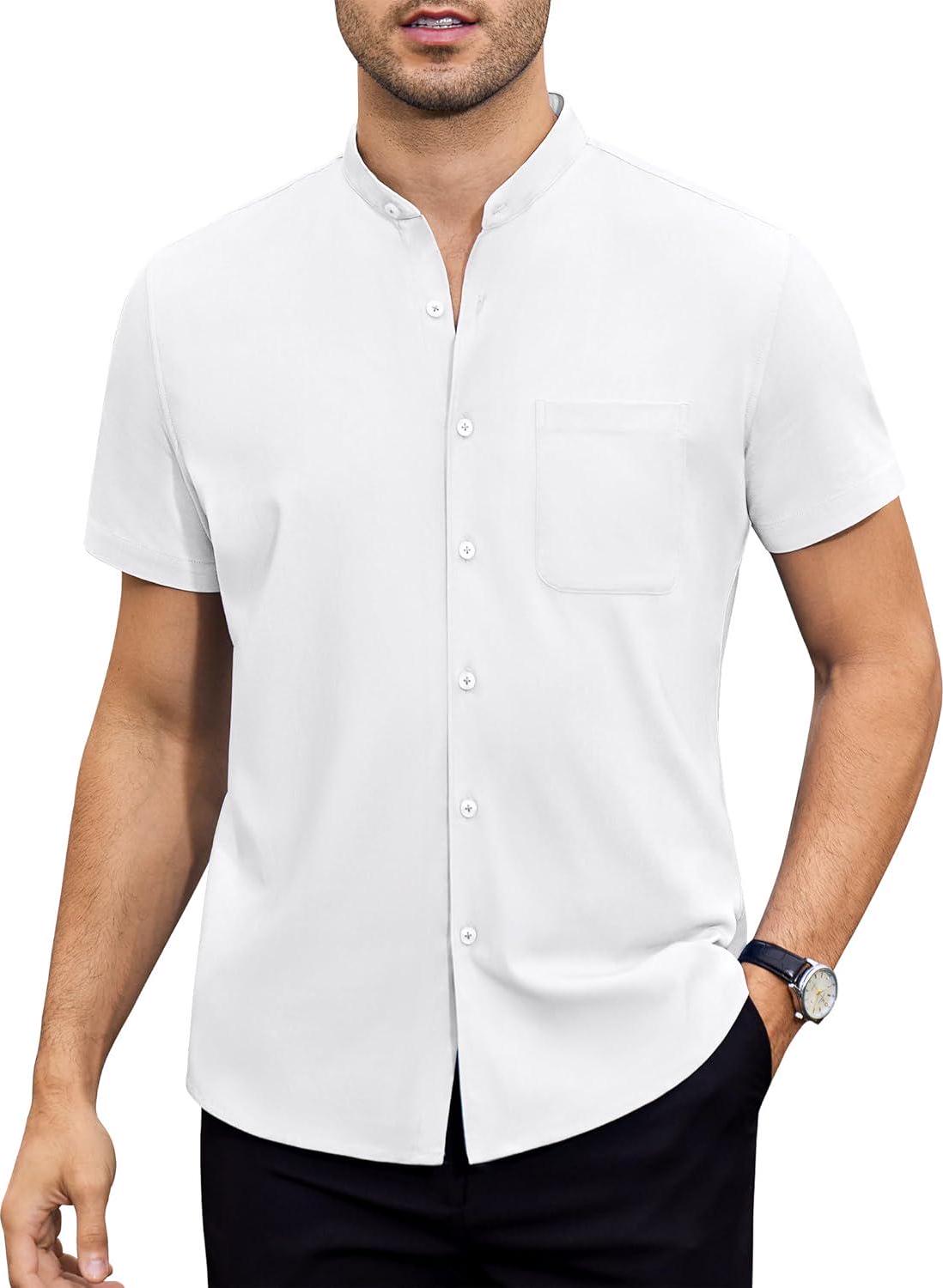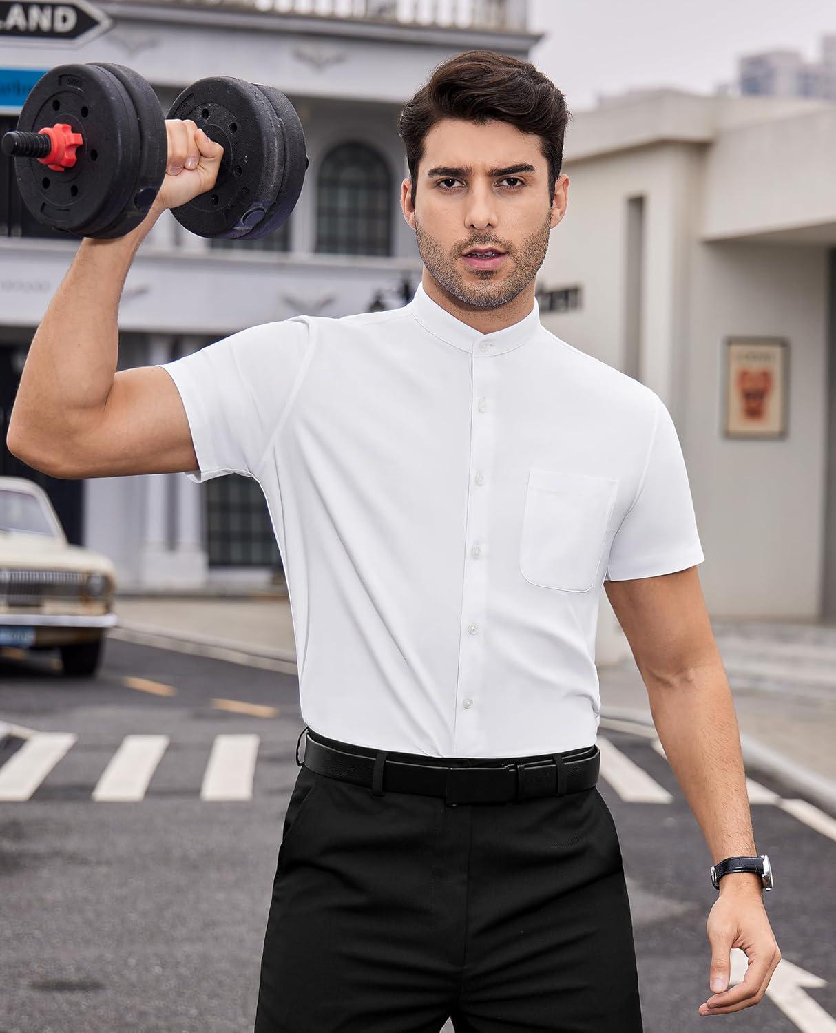 DEMEANOR Collarless Dress Shirts for Men Stretch Short Sleeve Dress Shirts