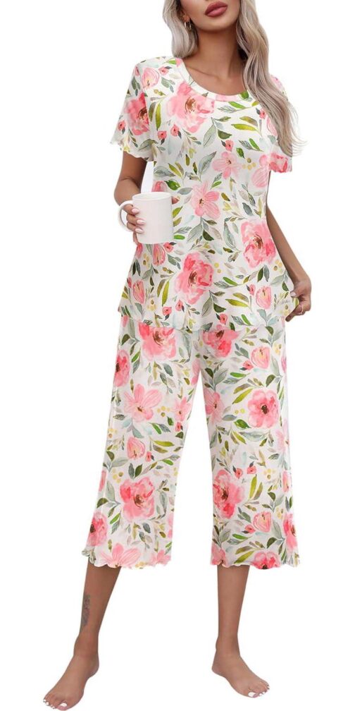 Ekouaer Women’s Pajamas Set Short Sleeve Top With Capri Pants Pjs Lounge and Sleepwear Set S-XXL