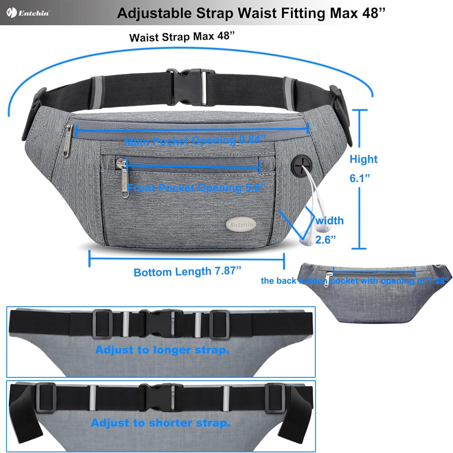 - Adjustable & Versatile Belt The fanny packs purse has an adjustable strap, with strong and reliable buckle, fitting ranges maximum up to 48 inches/ 122 cm (including the waist bag). It can be wear as a fanny pack, crossbody bag, shoulder bag or a small sling chest bag.