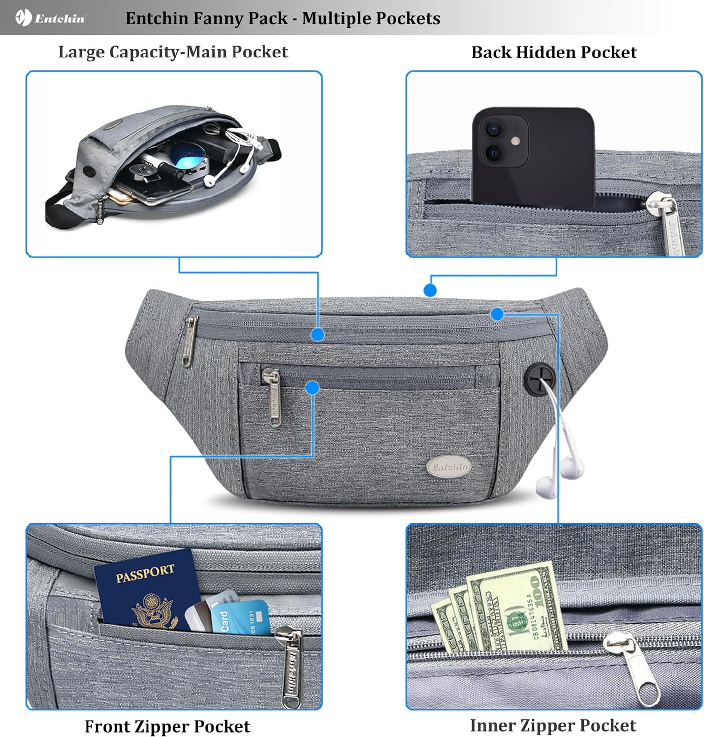 Entchin Fanny Pack for Women Men, Crossbody Bag with 4-Zipper Pockets, Large Capacity and Water Resistant Fashion Bum Bags for Hiking Running Travel Cycling
