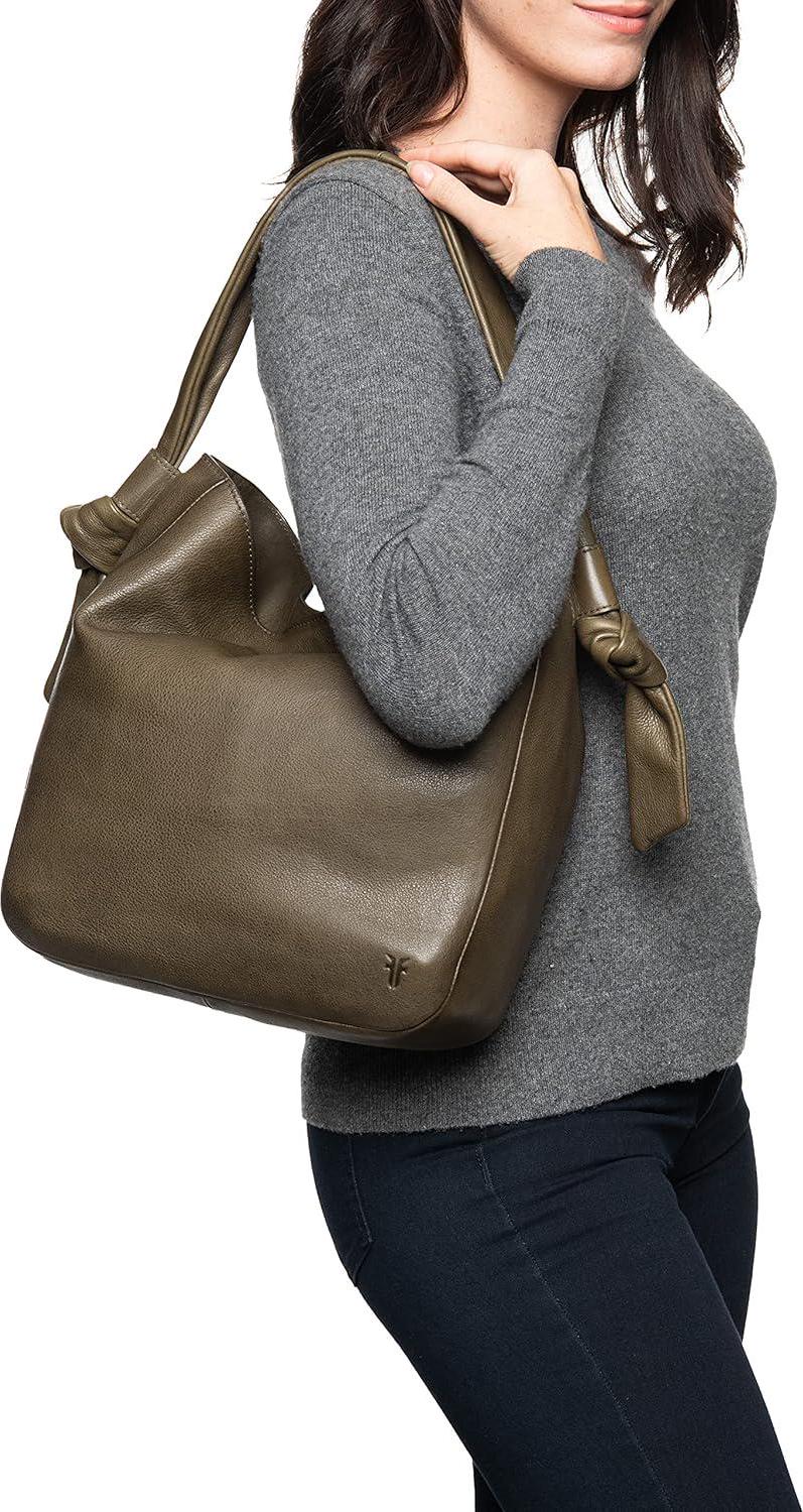 Antique brass with soft knot styling with hand burnishing and washed finish. Hidden magnetic closure. Front double org slip pocket and back zip pocket. Measurements: 13″H x 11.75″W x 3.25″D; Handle drop strap drop – 10″.