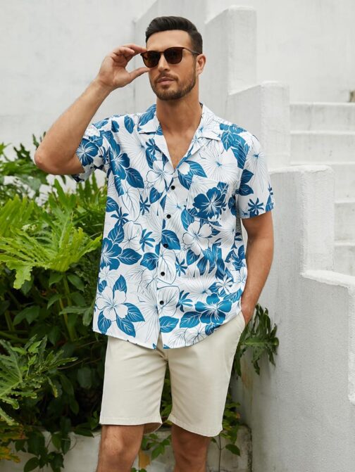 Hardaddy Hawaiian Tropical Floral and Leaf Printed Short Sleeve Shirt for Men