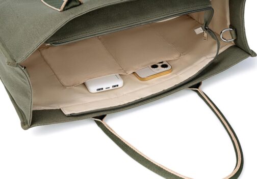 Separate multiple pockets to hold all your personal stuff. 1 main roomy pocket with no zipper suitable for A4 documents, 1 computer compartment for your 15.6 inch laptop or ipad, 2 small pockets for your cell phones, or cards.