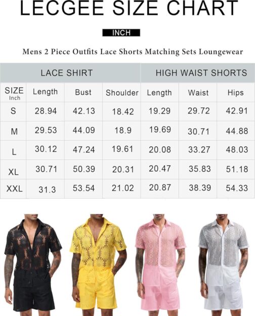 LECGEE Men 2 Piece Outfits Lounge Matching Sets Lace Shirt Shorts Trendy Clothes