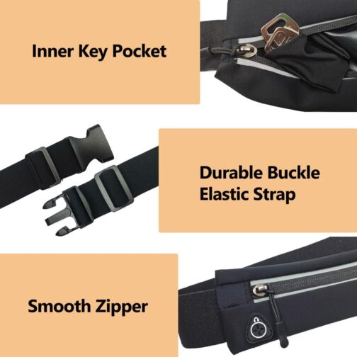 • Adjustable Waist Strap Running waist belt fits waist sizes from 27″ to 46″ with adjustable elastic strap, Prevents bouncing around while you running, jogging, walking etc