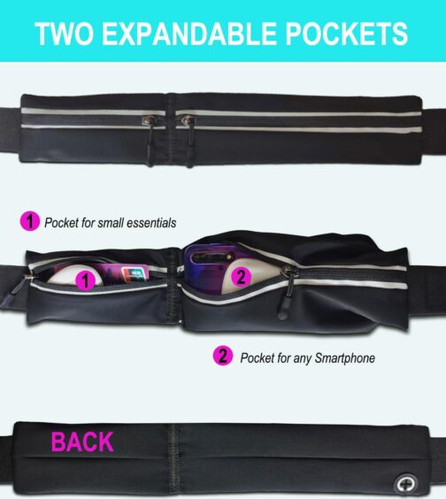- Two Expandable Pocket The expandable pockets allow you to carry any sized phone and most important essentials. Our running fanny pack is perfect for any outdoor sport activities such as running, jogging, walking, gym, cycling, hiking, shopping, traveling etc.