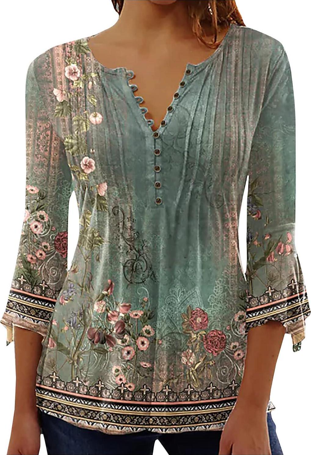 3/4 Sleeve Shirts for Women Bell V Neck Graphic T Shirts Button Pleated Boho Tops Elegant Vintage Floral Blouse