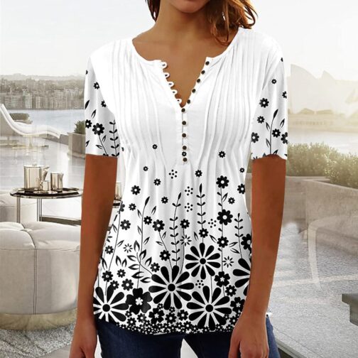 Women’s Floral Printed Pleated Button Short Sleeve T-Shirt
