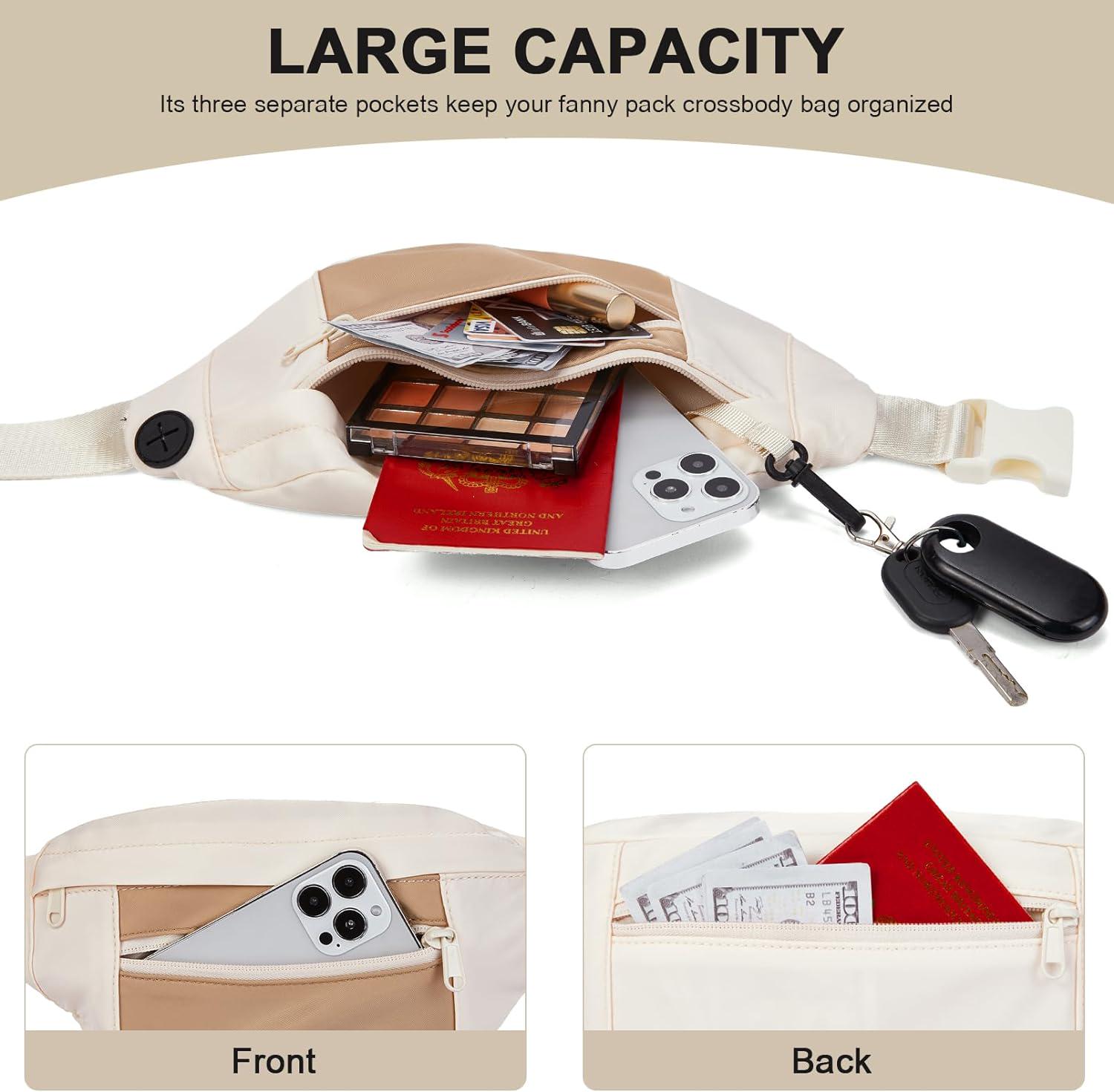 - Functional Design for Easy Organized – Comes with 1 main compartment including 1 key chain. There is also 1 hidden zip pocket in the front and 1 back zip pocket to keep your belongings safe while walking or running. Its three separate pockets keep your fanny pack crossbody bag organized while providing easy access to all your essentials, like your key, phone, wallet, etc.